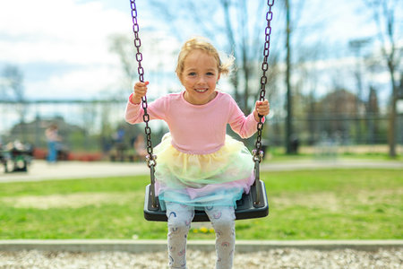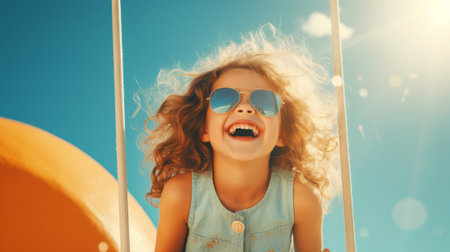 Happy kid girl laughing on a swing on a warm sunny day on a playground. Concept of carefree play, happy childhood, summer fun, and outdoor activities.