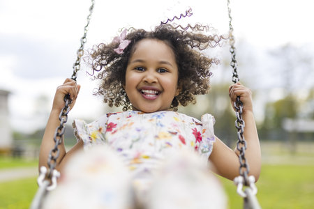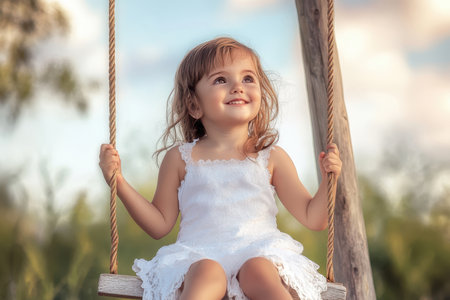 Young female child happily sitting on a swing, smiling brightly.