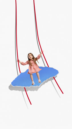 Little girl swinging on blue paper cloud in whimsical collage. Concept of childhood fantasy, imaginative learning, joyful creative play, and lighthearted surreal art evoking innocence and wonder.