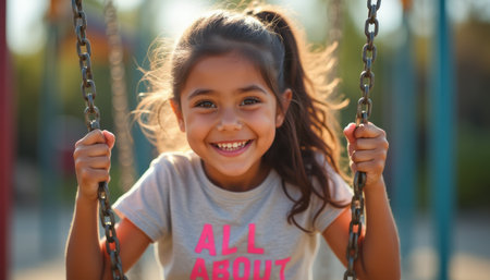 A cheerful young girl with long hair smiles brightly while swinging in a vibrant playground. Her playful spirit radiates joy, capturing the essence of childhood happiness and carefree moments.