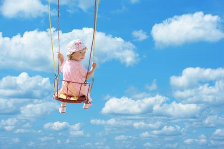 Cute baby boy swinging on a swing over blue sky background.