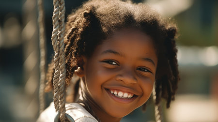 Close up smiling face, young african american girl playing on a swing, happiness, childhood, freedom, vitality, outdoor fun, carefree, sunlight. Generative AI AIG20.