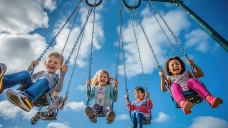 A joyful event of leisure and fun as a group of children travel through the sky on electric blue swings, happily sharing the experience in the clouds. AIG41