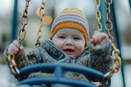 Happy infant enjoys a swing ride outdoors, wearing a colorful beanie