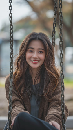 A joyful Asian woman enjoying a swing game outside in a park