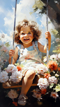 Retro style watercolor illustration of a smiling kid swinging on the swing, surrounded by flowers.