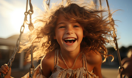 A joyful girl swings, her laughter echoing in the warm sunlight as she enjoys a lovely day outdoors.