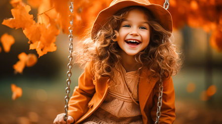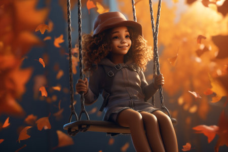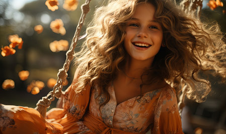 A cheerful teenager swings in a park bathed in warm autumn sunlight, surrounded by vibrant yellow and orange leaves. Her delightful smile radiates happiness as she embraces the moment.