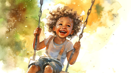 Happy African American kid laughing on a swing on a warm sunny day on a playground. Concept of carefree play, happy childhood, summer fun, and outdoor activities. Watercolor illustration