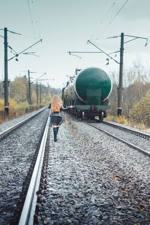 Young sexy girl with long hair in jeans on a railway. Alluring woman looking at camera