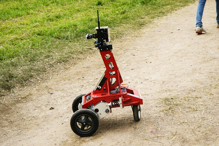 Red metal robot with 3 wheels. Machine stays on a ground. Head of the bot is turned away from a camera.