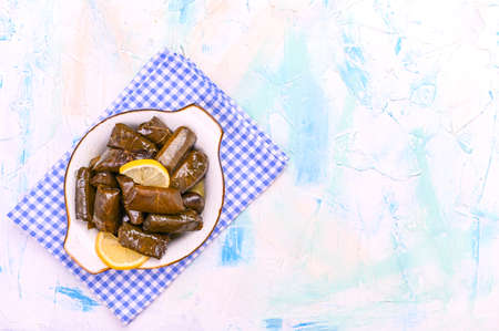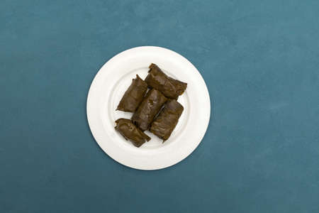 Delicious stuffed grape leaves (traditional doom Mediterranean cuisine Dolma) on white plate. Top view. Blue background with copy space.