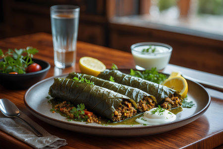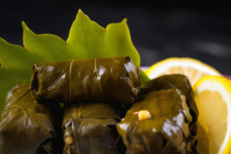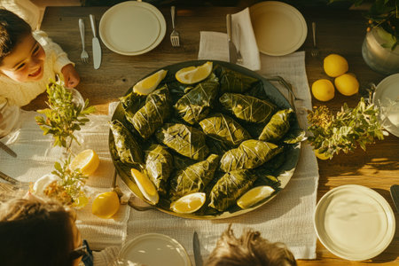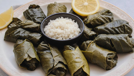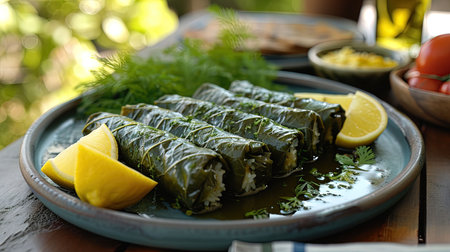 Experience the tantalizing flavors of Dolmades traditional grape leaves stuffed with a delectable mixture of rice minced meat and herbs This dish embodies cultural richness and communal dining perfect for a family meal Let the vibrant colors and glistening exterior of these perfectly formed rolls whet your appetite Garnished with lemon wedges this plate is a true feast for the eyes and tastebuds
