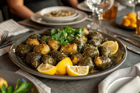 Egyptian stuffed grape leaves arranged on a silver platter, garnished with fresh herbs and lemon slices, highlighting traditional culinary art and healthy eating