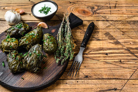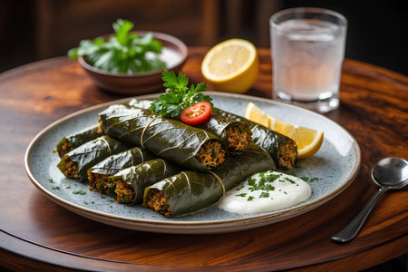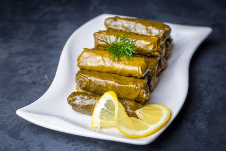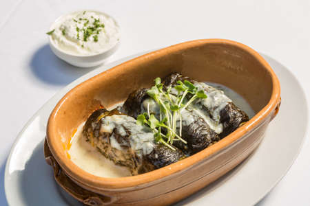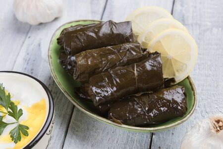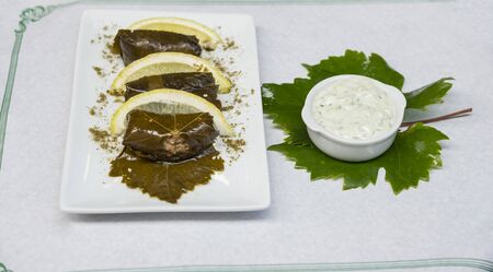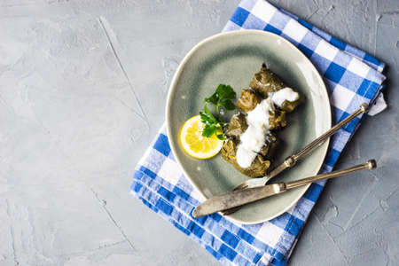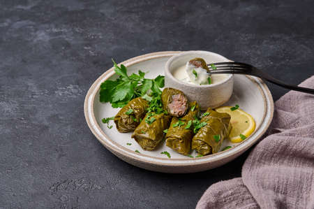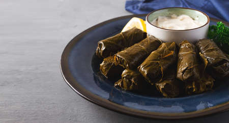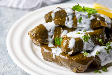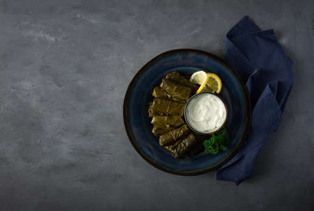 Delicious stuffed grape leaves rice, white yogurt sauce. Lebanese stuffed wrap on plate. Lebanon turkish greek middle eastern cuisine. (Turkish name; Leaf wrapping)