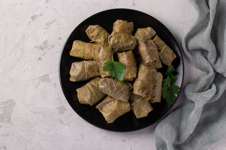 Dolma - stuffed grape leaves with rice and meat on black plate on light gray background. Traditional Caucasian, Greek, Ottoman and Turkish cuisine, Closeup