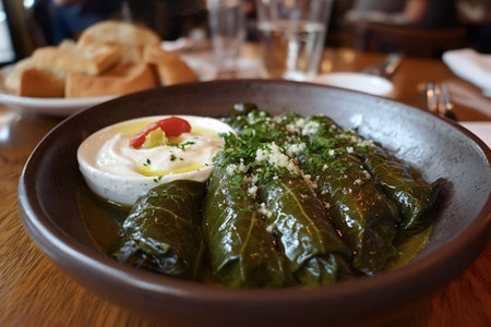 Close-up of dolmas, or stuffed grape leaves, served with creamy yogurt dip and garnished with herbs in a rustic earthenware bowl, highlighting authentic mediterranean cuisine
