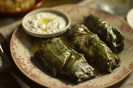 Vine leaves stuffed with rice and herbs, drizzled with olive oil and served with a creamy yogurt sauce, offer a taste of traditional Greek cuisine