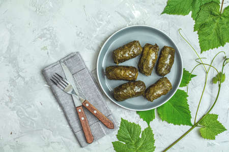 Dolma - stuffed grape leaves with rice and meat on a white plate on light gray background. Traditional Caucasian, Greek, Ottoman and Turkish cuisine, Top view