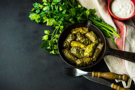 Dolma - stuffed grape leaves with rice and meat on a dark background, view from above. Traditional Greek. Caucasian and Turkish cuisine