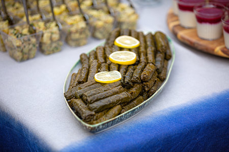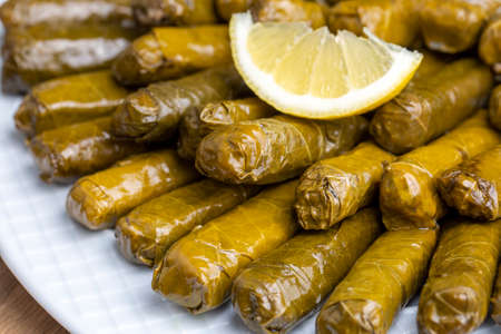 Traditional georgian dolma stuffed grape leaves with lemon.