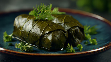 Glossy dolmas with herb garnish on deep blue plate. Veined leaves and rustic styling evoke clarity, tradition, and editorial depth in Mediterranean culinary storytelling.