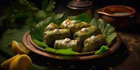 Dolma, cabbage rolls, grape leaves with filling, white sauce, lemon and herbs, rustic, selective focus, no people,
