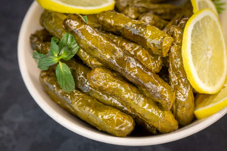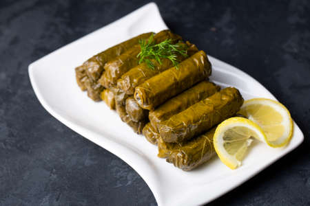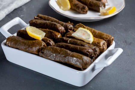 Yaprak sarmasi is a traditional Turkish dish made by wrapping rice stuffing with grape leaves. A tray of hand rolled sarmas are served on stone background with slices of lemon for added flavor.