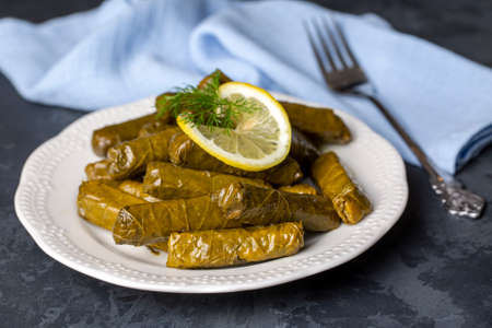 Plate of dolma with lemon. Dolma - stuffed grape leaves with rice and vegetable