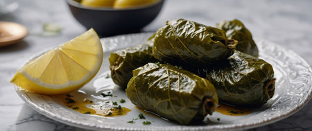 AI Generated. Dolma served on a white quartz background, Grape leaves stuffed with seasoned rice and herbs, Garnished with lemon wedges, turkish food