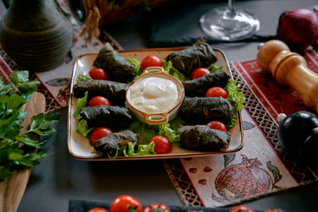 A Beautifully Arranged Dish of Stuffed Vine Leaves Accompanied by Fresh Cherry Tomatoes and Creamy Dressing on a Rustic Table Setting