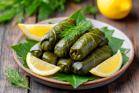 Traditional dolmades, grape leaves stuffed with rice and herbs, garnished with fresh dill and lemon wedges, served on a rustic plate
