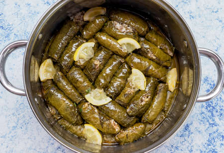 Delicious homemade stuffed grape leaves, the traditional dolma of the mediterranean cuisine in a cooking pot. Close-up.
