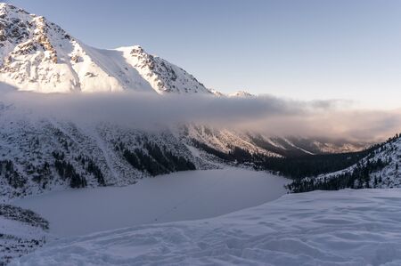 Lake Brebeneskul in the clouds, a view of the lake from the Montenegrin ridge, high-altitude ecologically clean lake in the Carpathians, a nature reserve. 2020