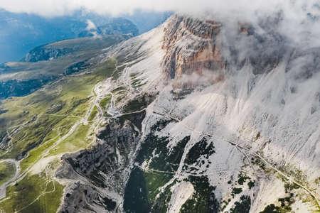Italian Dolomites, Tre Cime - Rifugio Lavaredo - stony road around Tre Cime .Peak in the clouds. Aerial shot.