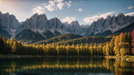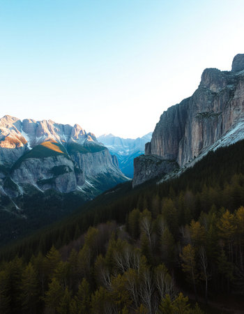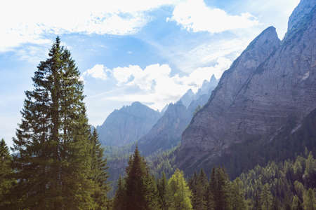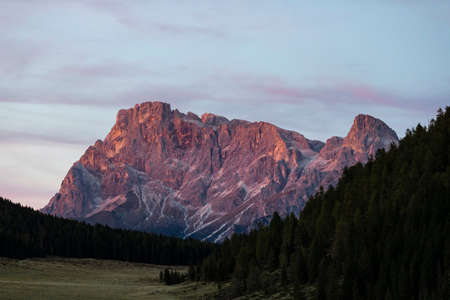 dolomite mountains in the morning scenery with the forest in the foreground in summer autumn