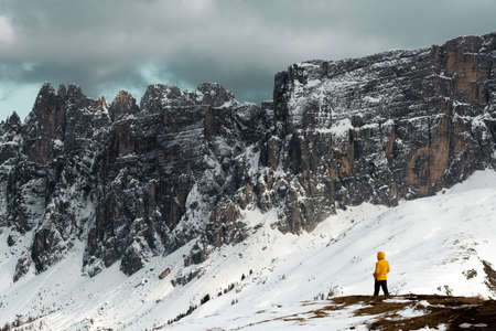 Man with yellow vest admiring the panorama of the snowy mountains. Ampezzo Dolomites.
