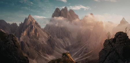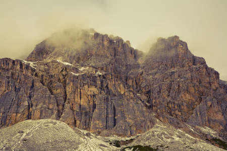 Mountain landscape with clouds and fog. Dolomites, Italy