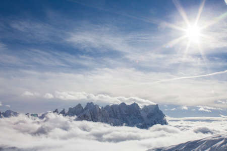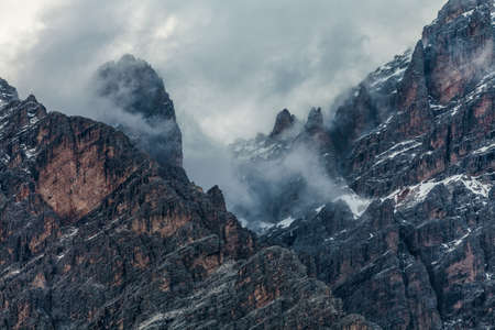 Epic close-up view of some mountain peaks somewhere in Dolomites, Italy. Arounded by clouds. High view
