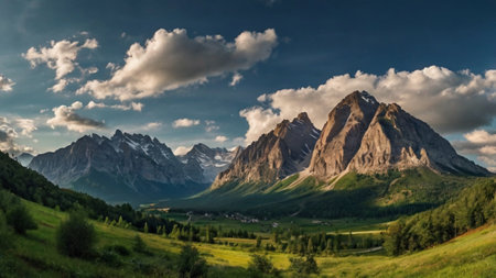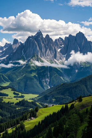 Idyllic Alps landscape with green forest on rocky mountain under beautiful sky