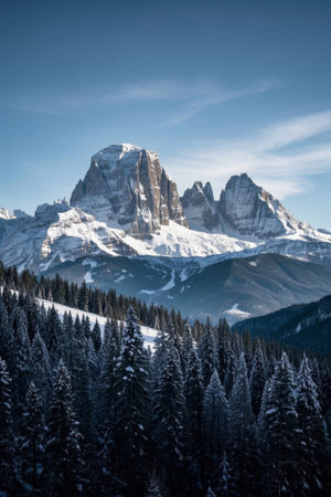 panorama of the Dolomites with snow-capped peaks and green conifers