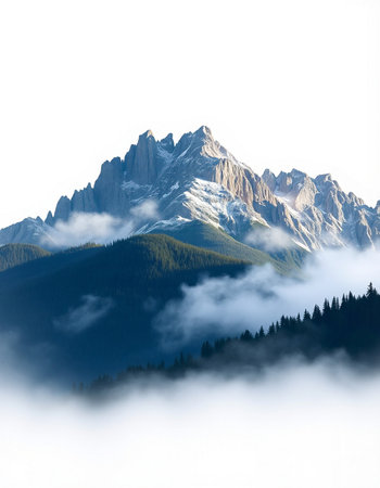 A breathtaking panorama of rugged mountains shrouded in mist, with peaks bathed in warm, golden sunlight. The scene captures the serene beauty of nature with clouds gently enveloping the mountain tops.
