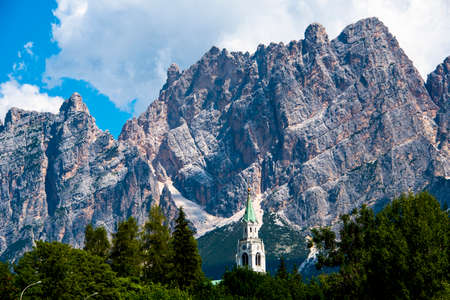 close-up of the bell tower of Cortina D'ampezzo and in the background the Ampezzo Dolomites in a beautiful summer day with blue sky and green pines in Belluno, Italy