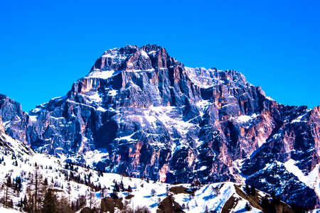 peaks of the Dolomites with snow, alpine valleys blue sky white clouds, snow tracks in the Zoldo valley, Belluno, Italy