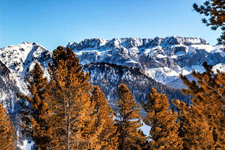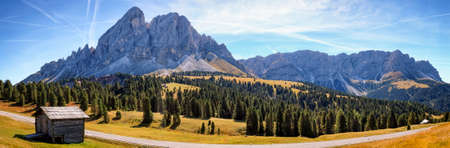 Autumn Dolomites panorama photo, sunset Trentino Alto Adige mountain pass, Italy