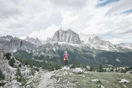 walking on the dolomitic paths protected by the attracts extraordinary panoramas between peaks of rock, white clouds on blue skies, hiking among the rocks near Cortina D'ampezzo, Italy