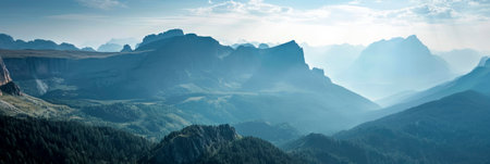 panoramic view of the forests and mountains of the Dolomites, Italy.