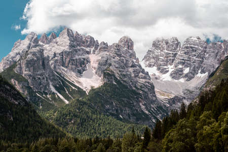 Mountainous landscape with clouds in Three Peaks Nature Park in Italian dolomite Alps, Sesto Dolomites in South Tyrol