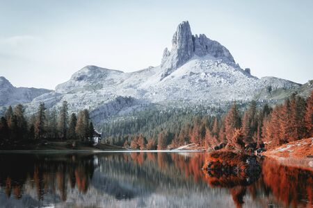 Alpine mountain moody autumn lake. Dolomites Alps, Italy