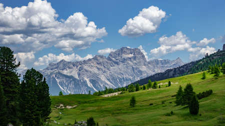 Mountain landscape in the Dolomites, Italy. Green meadows and mountains
